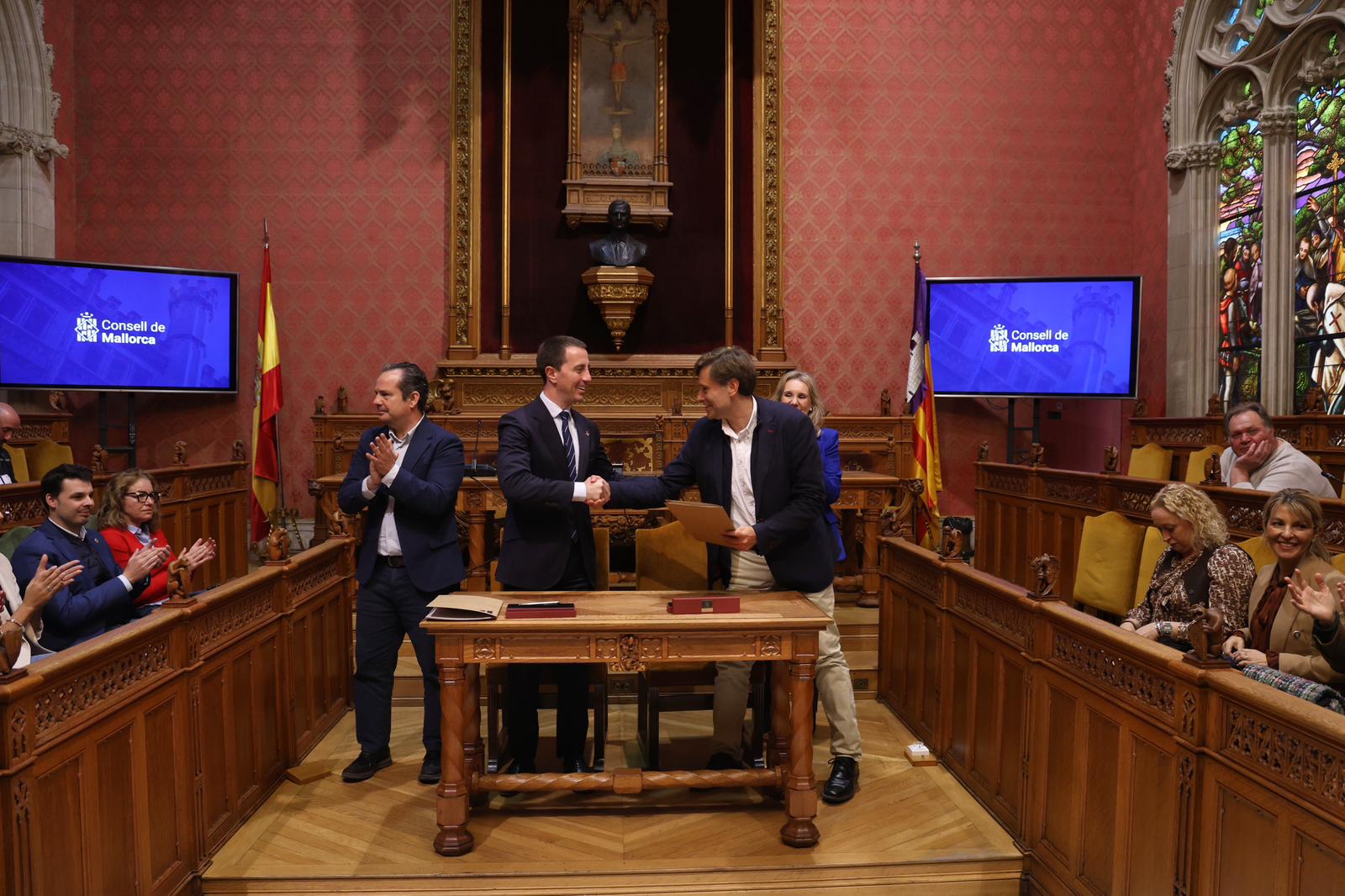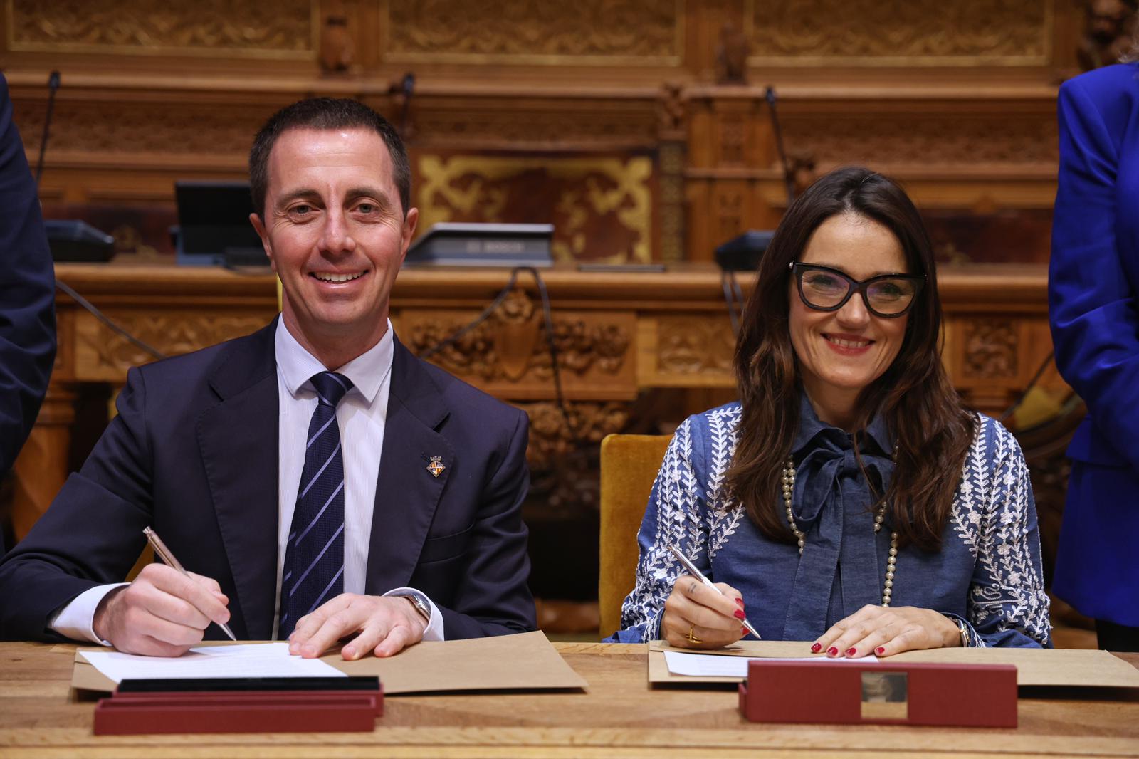 El president del Consell de Mallorca, Llorenç Galmés, acompanyat del conseller de Presidència, Toni Fuster, ha signat avui els convenis amb 45 ajuntaments de Mallorca que rebran finançament per reforçar i ampliar les polítiques locals de joventut. L’acte, que ha tingut lloc a la sala de plens del Consell, ha reunit batles i regidors responsables de l’àrea, que han formalitzat la col·laboració amb la institució insular i la concessió de les ajudes per impulsar projectes nous adreçats al col·lectiu de joves.
